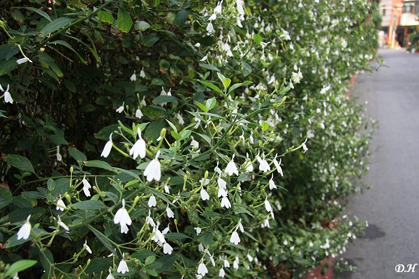東門路上鐵籬笆上開著小白花